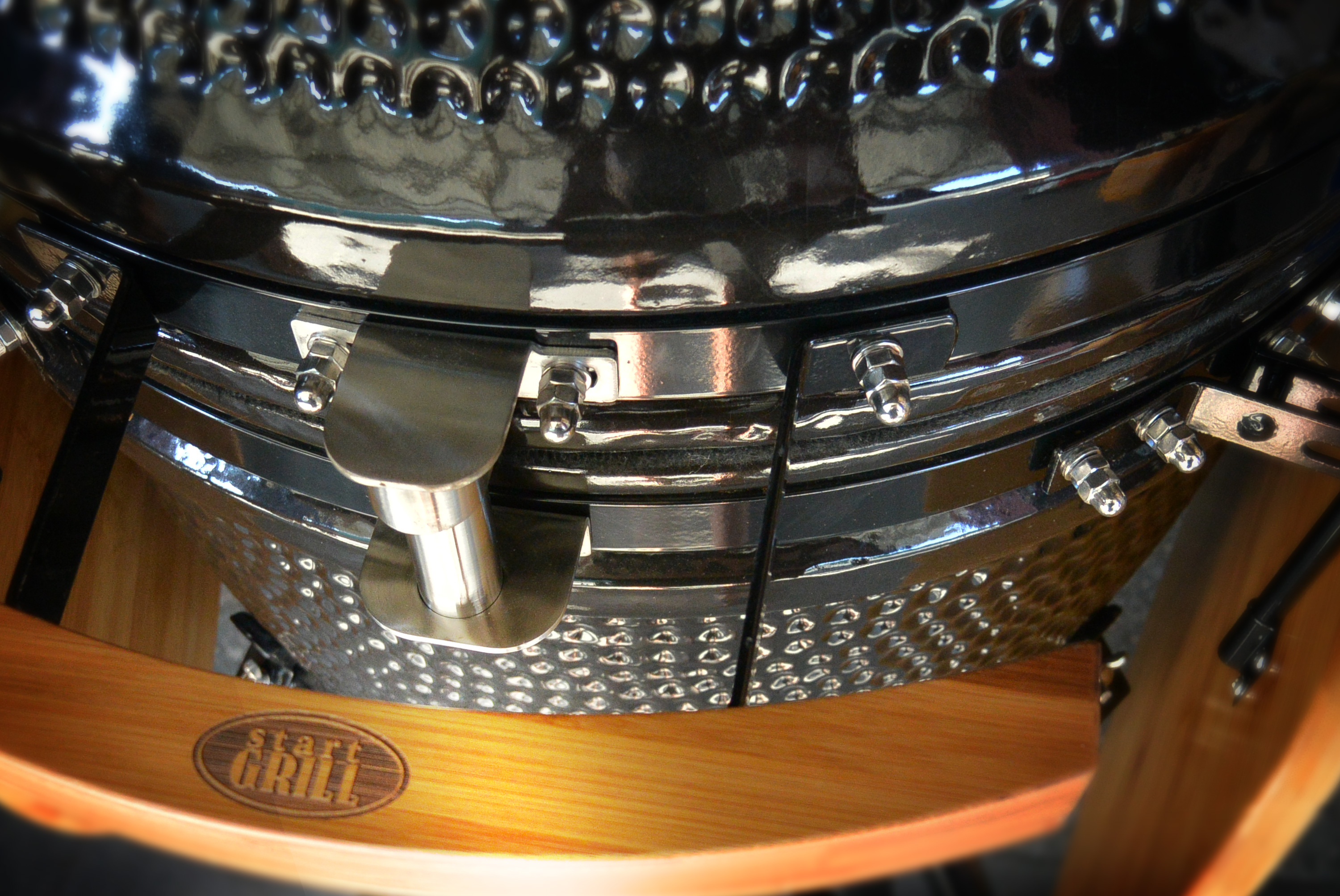 Керамический гриль характеризуется длительным сроком службы даже при круглогодичном использовании. Керамические стенки не подвергаются коррозии, не прогорают и не деформируются ввиду свойств материалов, использованных при изготовлении прибора. Толщина стенок – 20 миллиметров, они невосприимчивы к контрастным погодным условиям и жаропрочны даже в условиях низких температур окружающей среды. Иные элементы конструкции – обруч и тележка – выполнены из стали. Овальная форма позволяет аккумулировать тепло и экономно расходовать уголь. Регулируемые клапаны впускают кислород для горения топлива и отводят влагу, лишнее тепло и дым от горения. Размер жарочной поверхности 495 миллиметров удобен для приготовления стейков, шашлыка или запекания овощей для большой компании.